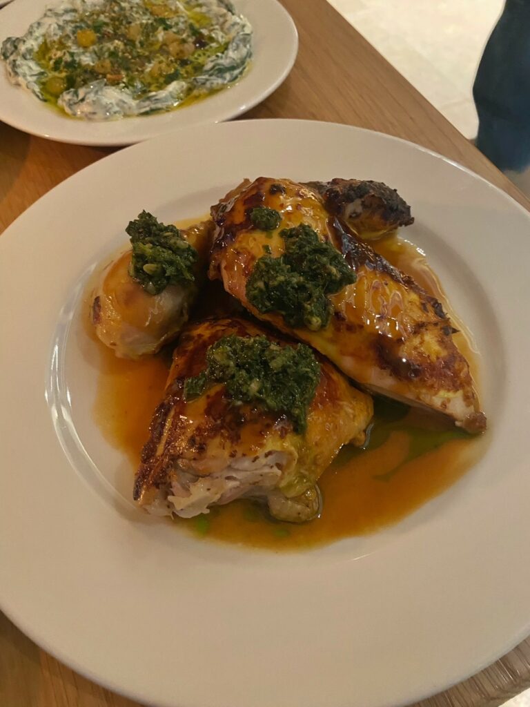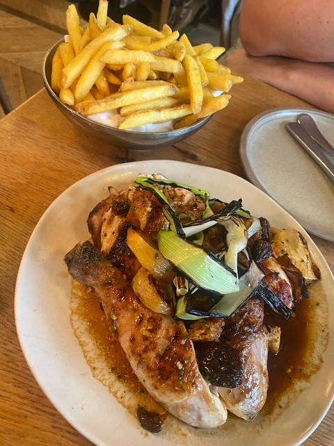 Stand out dish 5 – wood roast half chicken with Café de Paris butter, morels and baby leeks with a side of duck fat fries at Dove