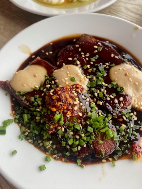 Stand out dish 3 – pork belly with gochujang miso tahini and cured egg yolk at Babushka evenings